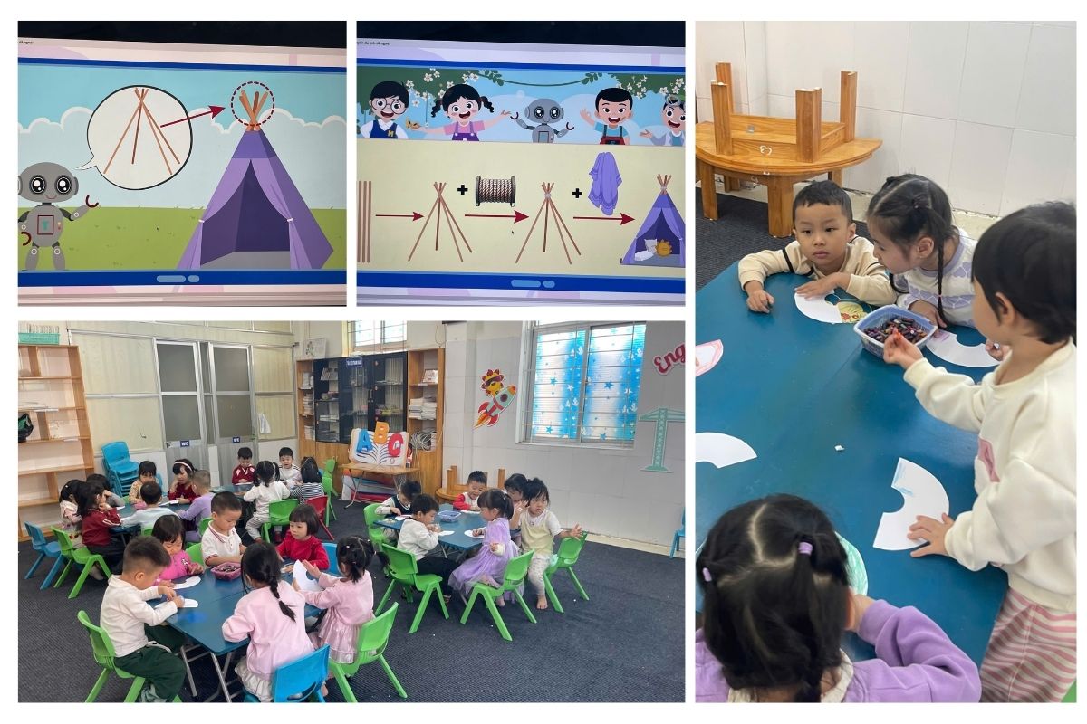 Trong tiết học “Làm lều cho chuyến du lịch dã ngoại”, các bé 5–6 tuổi được hóa thân thành những “kỹ sư nhí”, tự tay thiết kế, dựng và trang trí chiếc lều cá nhân mini cho chuyến phiêu lưu của riêng mình. Đây là một tiết dạy thực tế được thực hiện theo mô hình giáo án điện tử STEAM – 5E (Gợi mở – Khám phá – Giải thích – Mở rộng – Đánh giá), giúp trẻ học qua trải nghiệm và phát triển đồng thời nhiều năng lực.